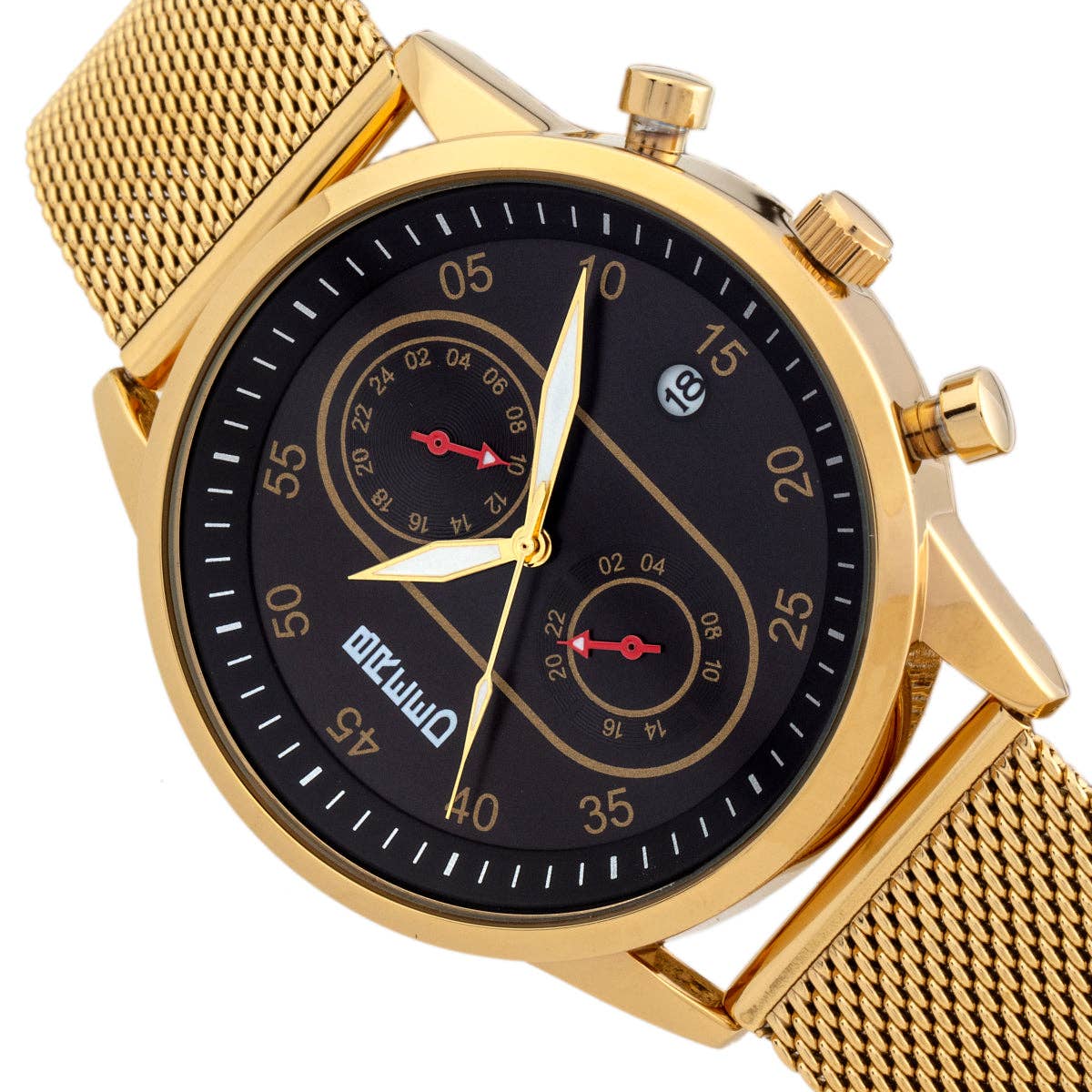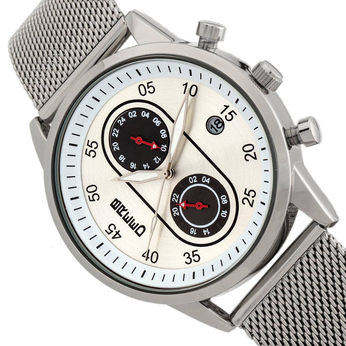 Polished Alloy Case Precision Japanese Quartz Movement Non-Glare Scratch Resistant Mineral Crystal Logo-Engraved Stainless Steel Caseback Mesh Alloy Bracelet Logo-Engraved Stainless Steel Box With Tongue And Safety Clasp Luminous Hands Date Indicator Dual Time Sub-Dial 24-Hour Sub-Dial 42mm Case Diameter 5 ATM Water Resistance