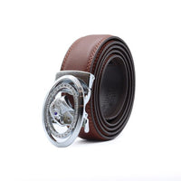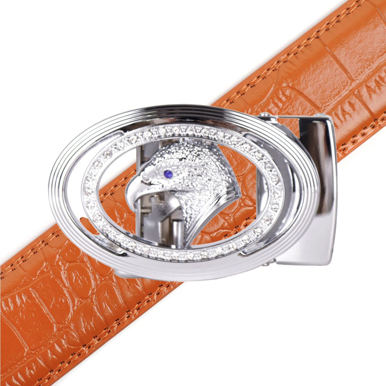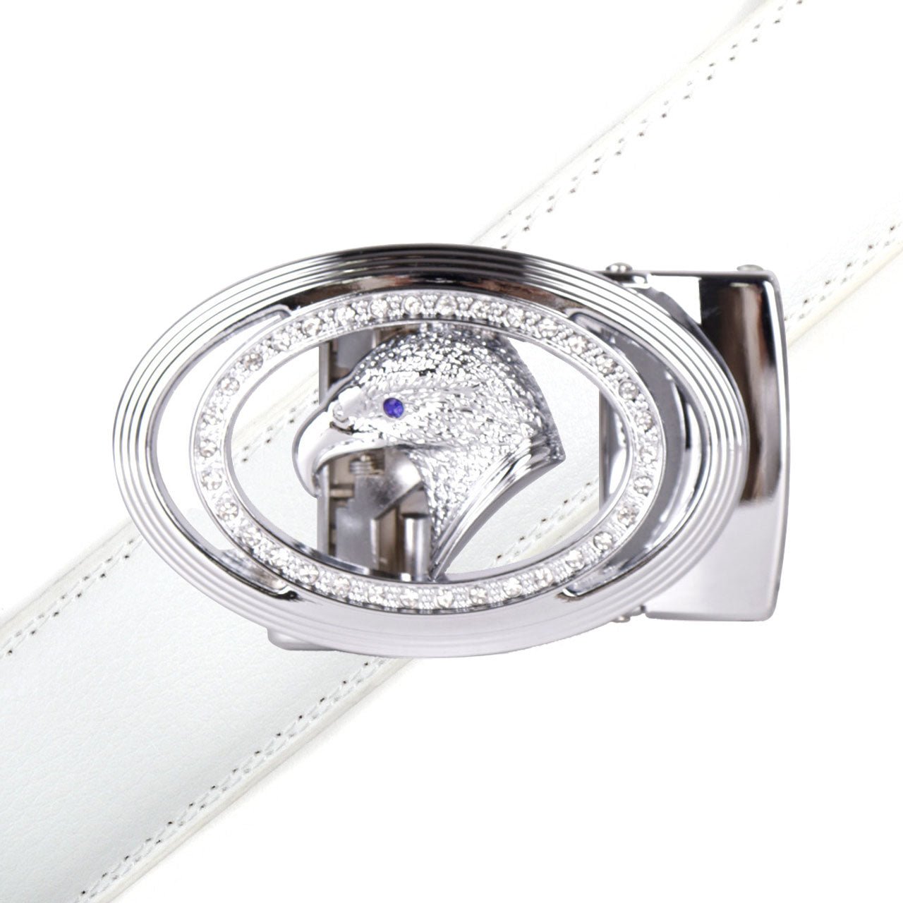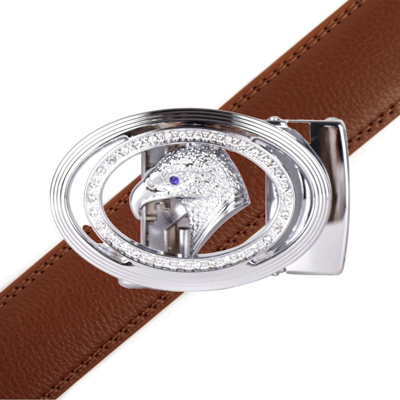 Take your look to the next level with this Men's Eagle Bling Ratchet Belt. The auto-locking buckle slides along strong rubber teeth for 1/8-inch adjustments, so you get a perfect fit. Choose between 14 genuine leather belt straps and the buckle is made of a strong alloy for long-lasting wear. Cut the 46" belt down to your perfect size and easily remove or reattach the buckle for ultimate versatility. Get the perfect fit every time with this stylish and durable belt.
