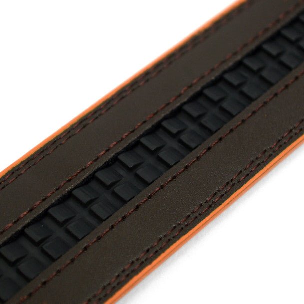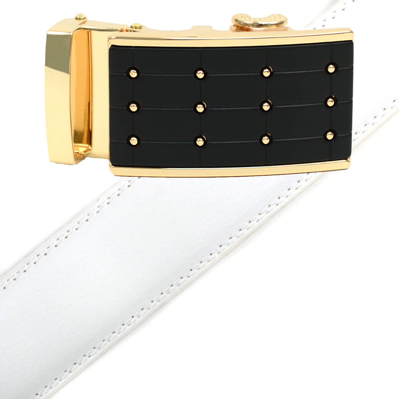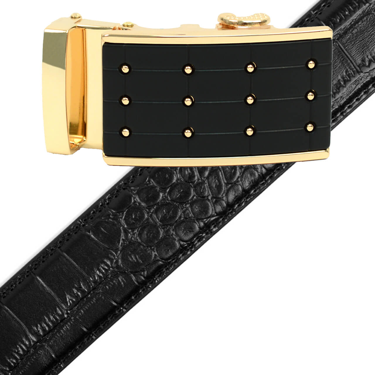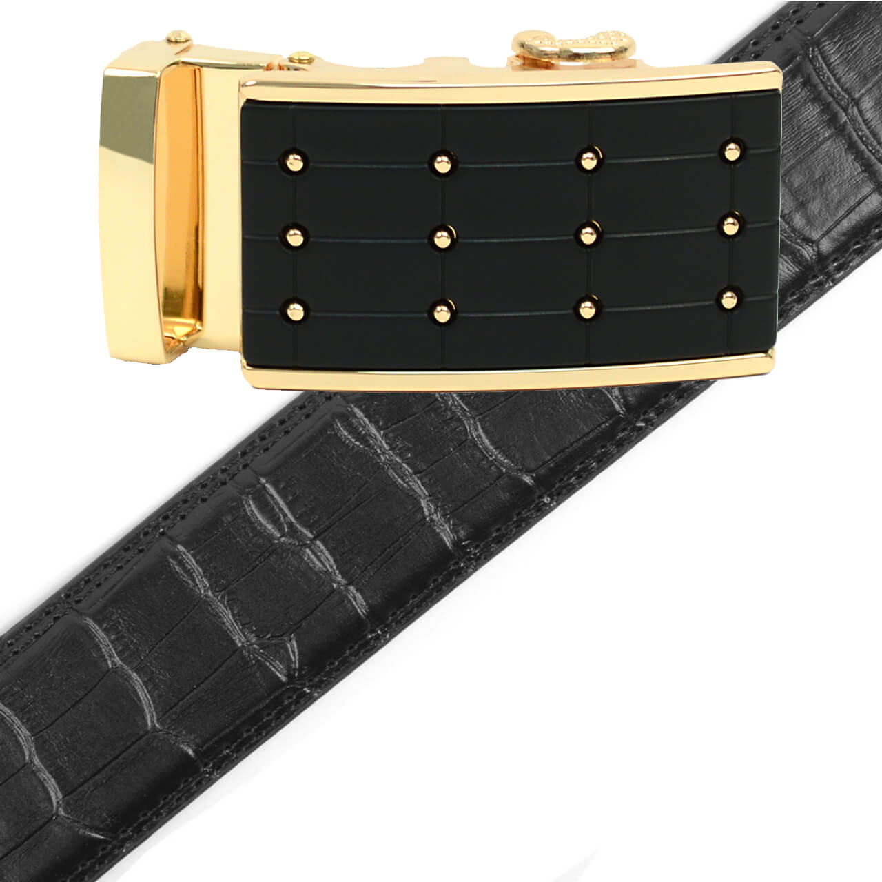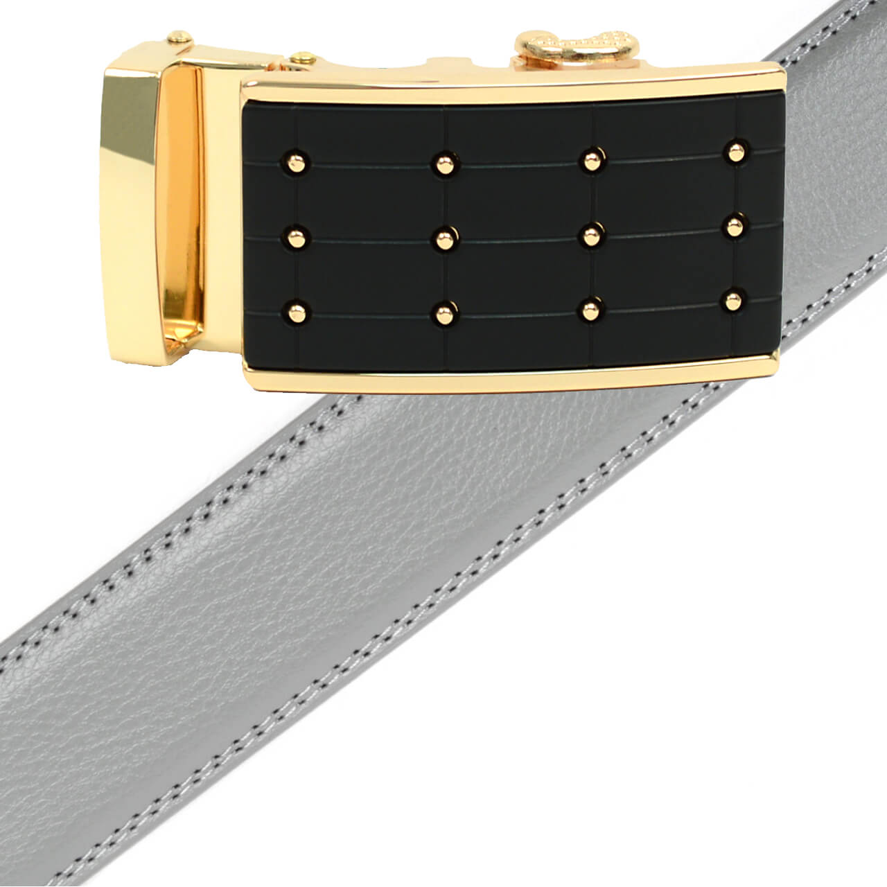 Take your look to the next level with this Men's Genuine Leather Sliding Buckle Ratchet Belt. The auto-locking buckle slides along strong rubber teeth for 1/8-inch adjustments, so you get a perfect fit. Choose between 14 genuine leather belt straps and the buckle is made of a strong alloy for long-lasting wear. Cut the 46" belt down to your perfect size and easily remove or reattach the buckle for ultimate versatility. Get the perfect fit every time with this stylish and durable belt.
