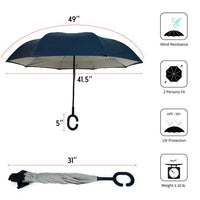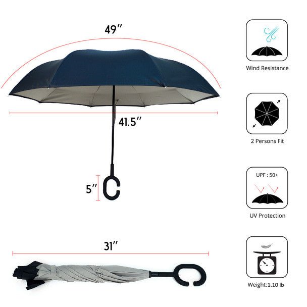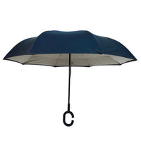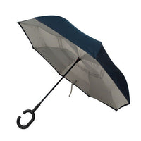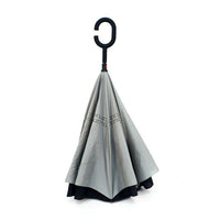 Inside Out folding: you can open this upside down umbrella as you open the door of your car and not get wet. When collapsed the wet side becomes inside with the dry side exposed.