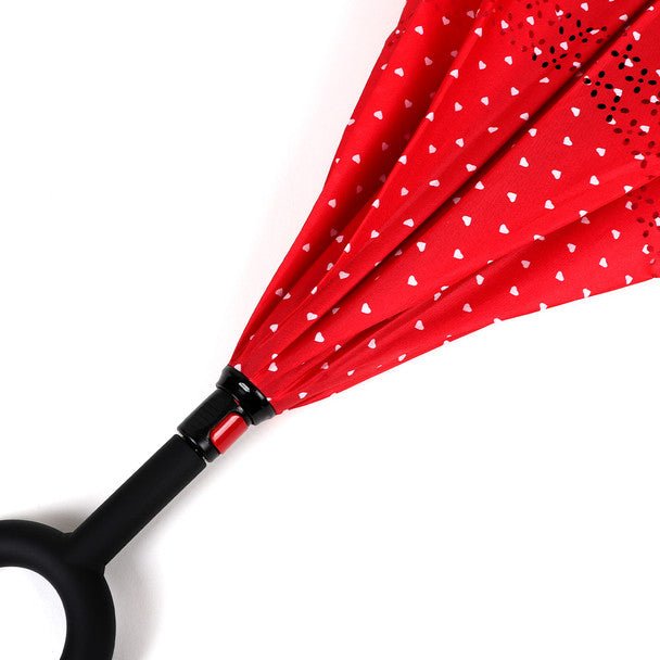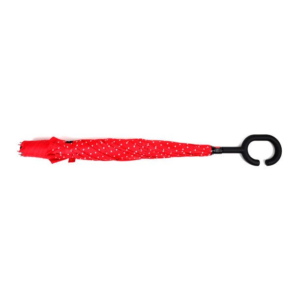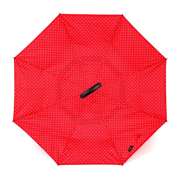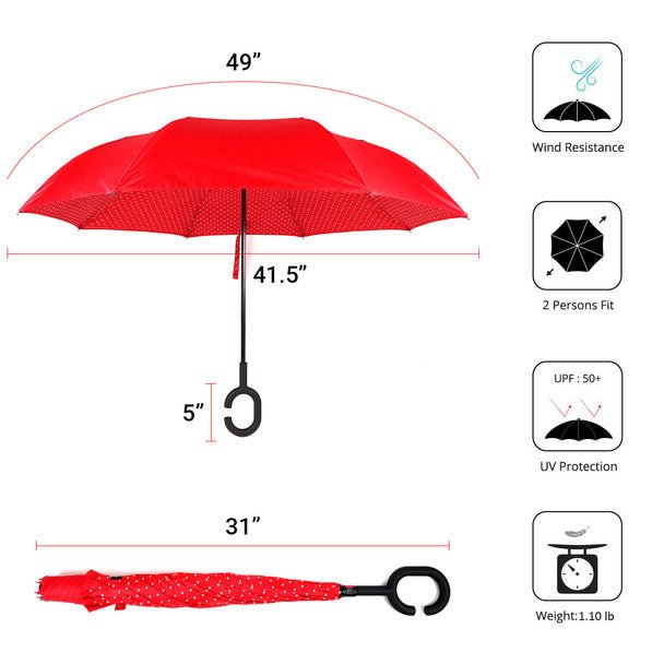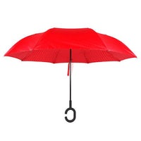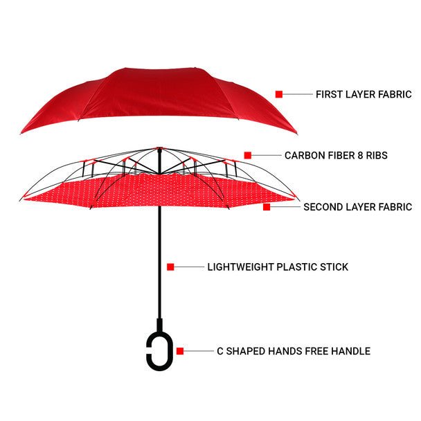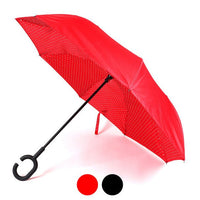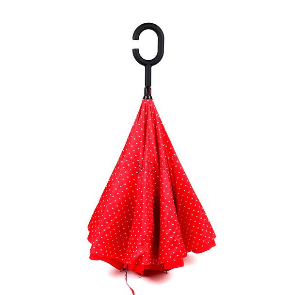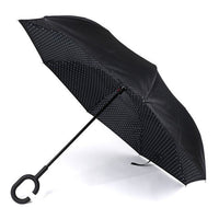 Inside Out folding: you can open this upside down umbrella as you open the door of your car and not get wet. When collapsed the wet side becomes inside with the dry side exposed.