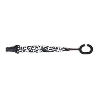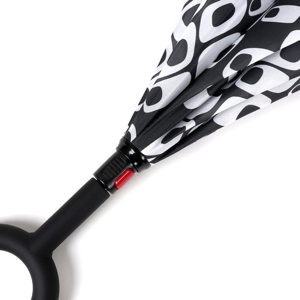 Inside Out folding: you can open this upside down umbrella as you open the door of your car and not get wet. When collapsed the wet side becomes inside with the dry side exposed.