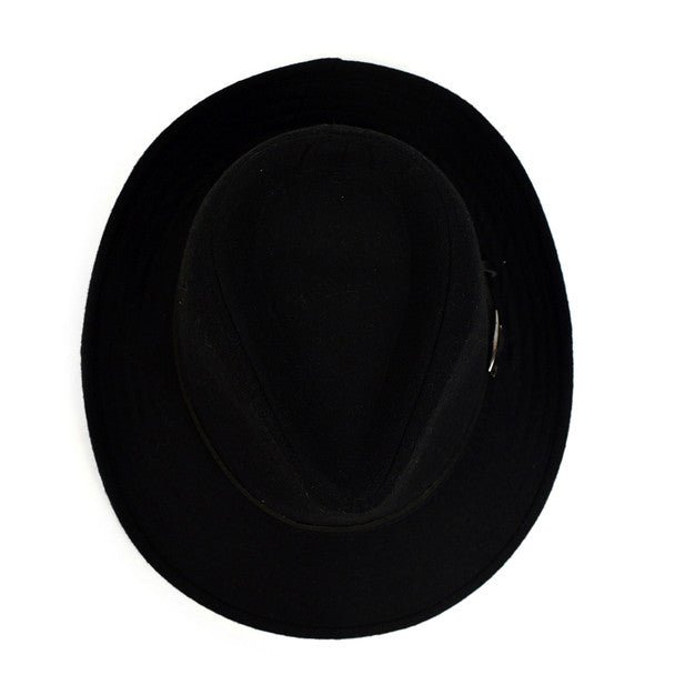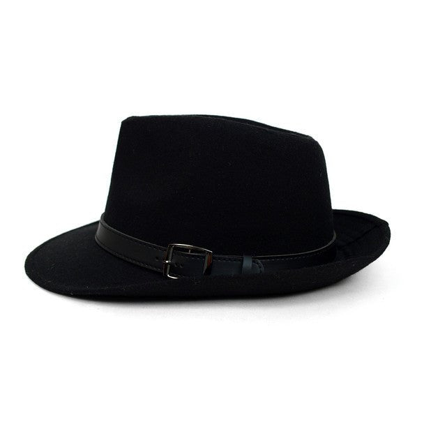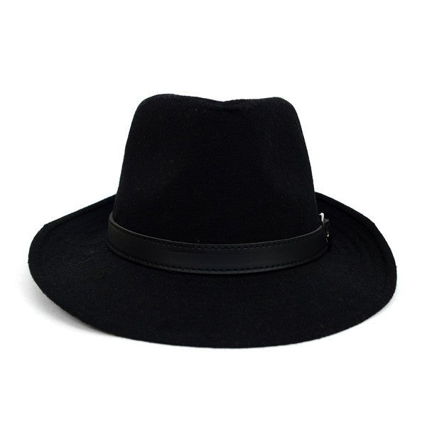 Fall/Winter Wide Brim Black Trilby Fedora Hat with Black Belt Trim - H1805263