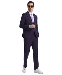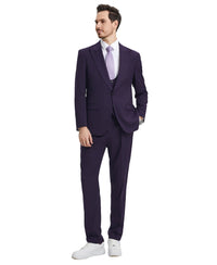 Elevate your wardrobe with the Stacy Adams Hybrid Fit Purple Vested Suit. Classic styling meets modern sophistication with its single-button closure, peak lapel, and bold color. The hybrid fit offers a balance of classic and slim fit for comfort and flattering style. The flat front pants and 4-button vest with U-shaped collar add sophistication and individuality. All sizes are jacket sizes, pants unhemmed for customization. Make a statement with style and confidence, whether for a wedding, business, or gala. Experience the perfect combination of classic design and modern sensibility.