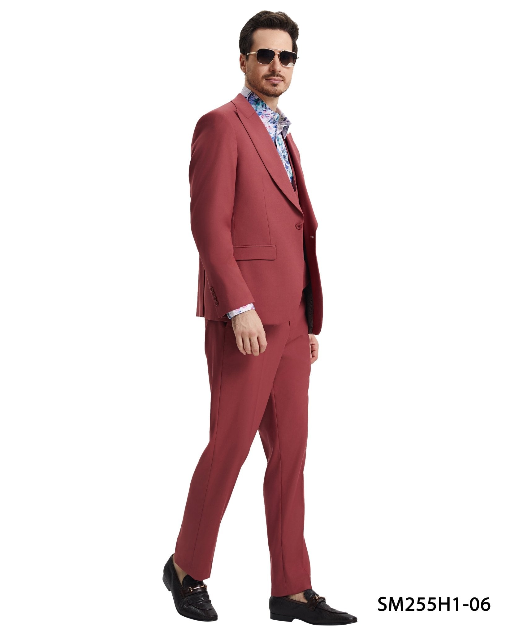 A modern, premium 3-piece set, the Stacy Adams Hybrid Fit Solid Coral Suit adds timeless elegance. Featuring a one-button closure and peak lapel, this suit stands out for weddings, galas, or business functions. Its hybrid fit provides a mix of modern slim and classic; pants are flat front, vest 4-button with U-shaped collar. Invest in quality, invest in style – choose Stacy Adams.