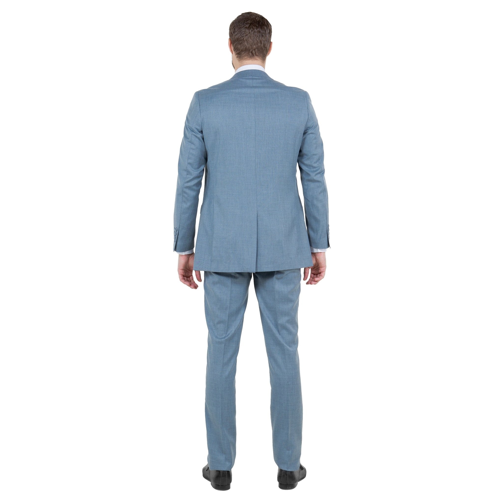 Step into refined elegance with the Tazzio Smoke Blue Men's 2pc Sharkskin Suit Slim-Fit, where sophistication meets modernity flawlessly. Crafted with precision, this suit features a sleek slim notch lapel, a two-button front closure, and underarm sweat guards for all-day comfort. Inside, discover an interior French facing and ample pockets for convenience. The flat-front pants boast the distinctive sharkskin pattern and practical features like two back besom pockets and two front angled slip pockets. Lined to the knee with a 37-inch inseam, they offer a tailored fit with a secure zip fly and extended button closure. Elevate your style effortlessly with this refined ensemble, perfect for making a statement at any occasion.