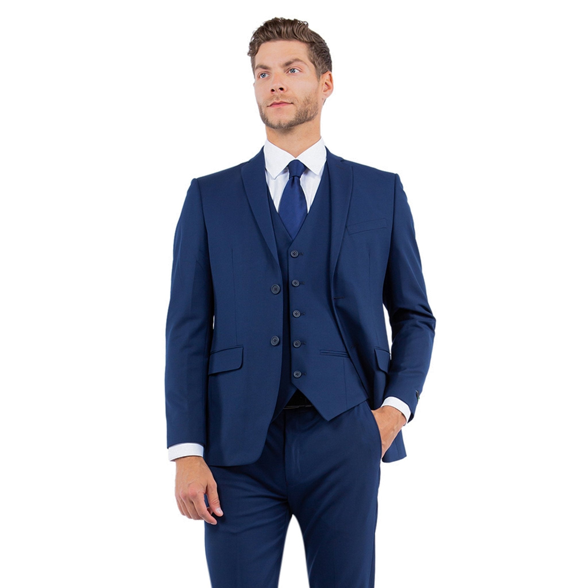 Upgrade your wardrobe with the Zegarie 4-Way Stretch Men's 3pc Suit Set. This sleek, slim-fit suit features a one-button jacket, classic V-neck vest, and flat-front pants with practical pockets. Made from flexible 4-way stretch fabric, it offers unmatched comfort and style for any occasion. Elevate your look with Zegarie���s perfect blend of sophistication and ease.