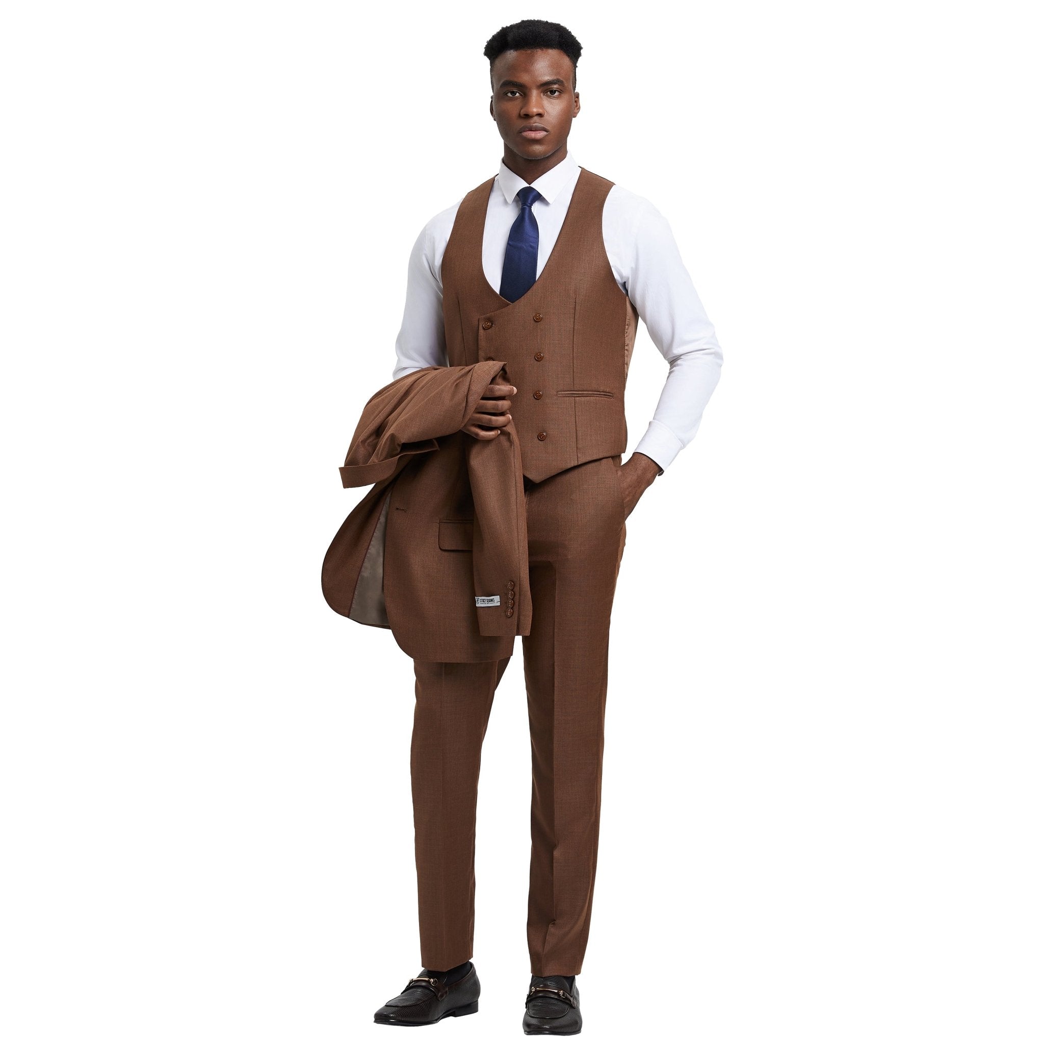 Experience elegance and versatility with the Men's Stacy Adams Sharkskin 3-Piece Cognac Suit. This sophisticated ensemble features a sharkskin jacket with a two-button front closure, notch lapel, and side vents for a classic look with added comfort. The interior French facing and three pockets offer practicality, while underarm sweat guards ensure all-day comfort. The double-breasted vest adds a formal touch with a solid texture and four-button closure, while the flat-front pants maintain a sleek silhouette with two back besom pockets and two front angled slip pockets for convenience. This suit is perfect for weddings, business meetings, or any occasion where you want to make a memorable impression. Choose Stacy Adams for a timeless blend of tradition and modernity.